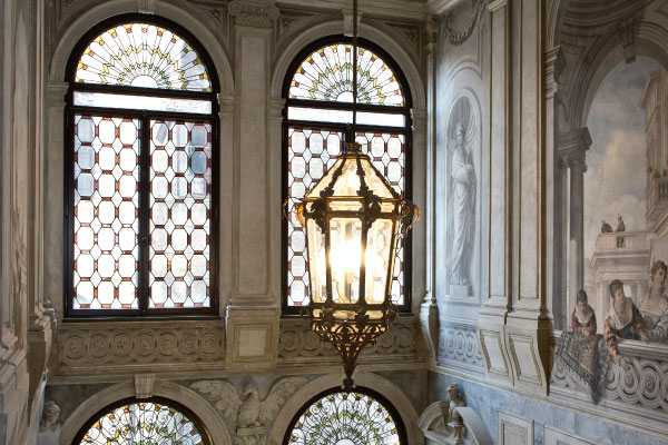 ベネチアに到着すると、パラッツオまではアマン専用の船が運んでくれます。 途中、パノラミックな情景に感動しながら大運河に入り、アマンに到着します。 館内に入ると、随所にフレスコ画や芸術的な騙し絵、モザイクタイル、シャンデリアなどが当時のまま使われ、貴族の優雅な館の暮らしぶりが偲ばれます。