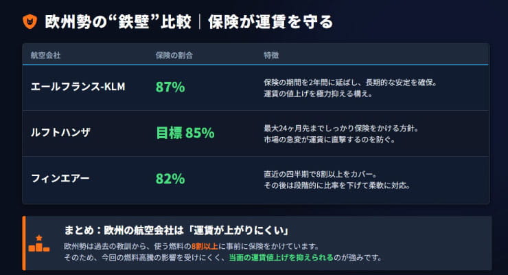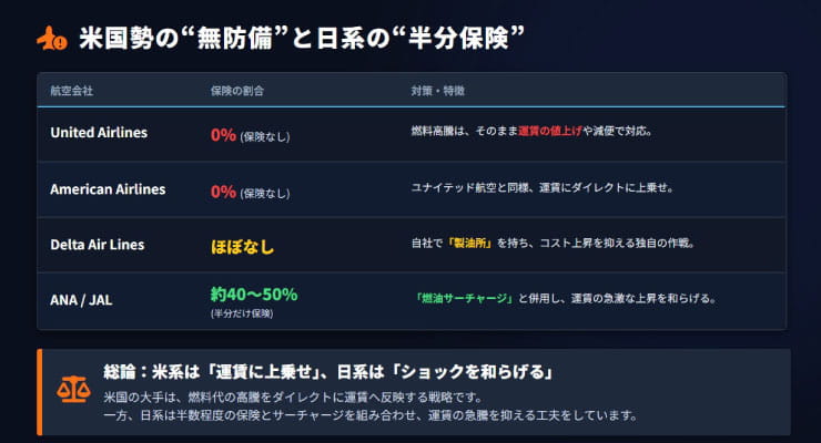 ここで重要なポイントは、事前に備えていた航空会社は、急な燃料価格の値上がりに比較的強いという点です。一方で、こうした備えが弱い航空会社は、燃料価格が急騰した際に直接的な影響を受けやすくなります。