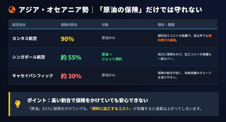全体として見ると、アジア・オセアニア系航空会社は、燃料価格高騰への耐性が「中間層」に位置するグループと考えるのが分かりやすいでしょう。