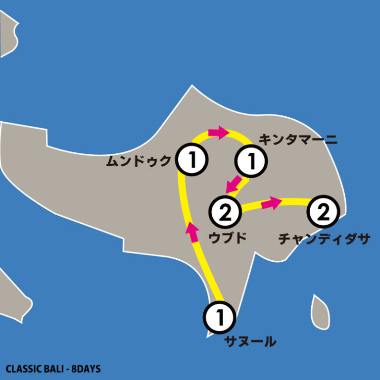 東部を代表するビーチ・チャンディダサや、南部の美しい島・ヌサレンボンガンの他、芸能・芸術の町・ウブドや、雄大なパノラマが一望できるキンタマーニ高原など、バリ島を一周、ゆったりした時間を満喫する1週間。
