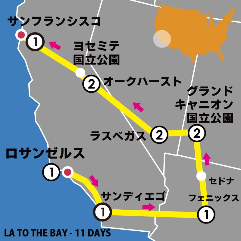 アメリカ人気No.1ツアー!サンフランシスコ、ロサンゼルス、ラスベガスなど大都市プラス、ヨセミテ公園、グランドキャニオンなど自然も楽しめる欲張りツアー!!冬はスキーリゾート・タホ湖でウィンタースポーツにチャレンジ!