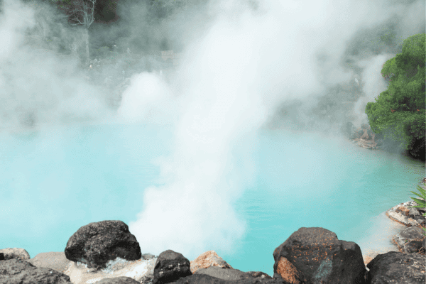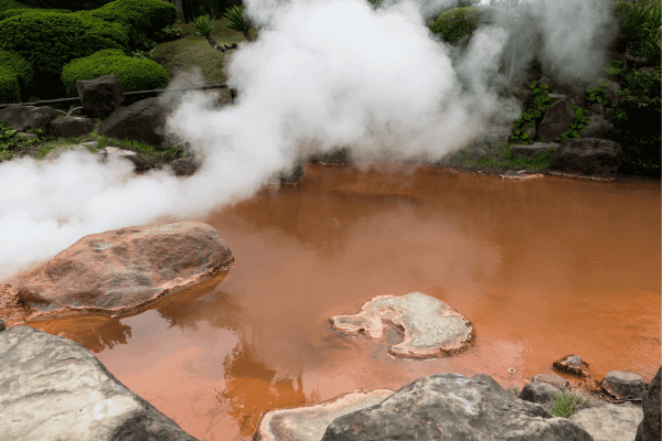 【午後】別府名物地獄めぐり ①海地獄 ②鬼石坊主地獄 ③かまど地獄 ④鬼山地獄:通称「ワニ地獄」 ⑤白池地獄 ⑥血の池地獄 ⑦龍巻地獄:勢い良く噴出する迫力の間欠泉
