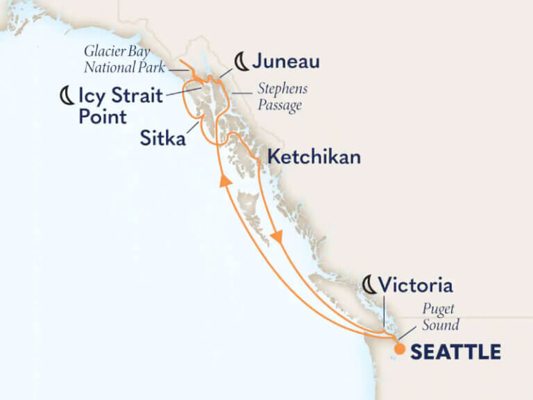 シアトル発着で巡る、アラスカの壮大な大自然を満喫する周遊クルーズ。グレイシャーベイでの景観クルーズでは、凍りついた巨大な氷河を間近で体感できます。ジュノー、シトカ、ケチカンにも寄港します。