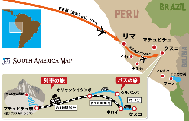 マチュピチュ遺跡訪問には、まずは麓の村、「マチュピチュ村」を目指すことになります。一般的な方法は、クスコより鉄道(+バス)の手段になりますが、欧米人をはじめ、アウトドア派に人気があるのは、古くから伝わる、「インカ道」を歩きながら、本格的な装備で臨む、トレッキングの方法です。ジェイエスティでは、前者の「鉄道+バス」の方法を最もお勧めし、その手配を得意としております。