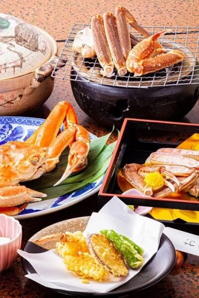 メインディナーはタグ付き松葉ガニフルコース(献立例)蟹刺し → 焼きガニ → 蟹すき鍋 → 雑炊 → 蟹味噌アイス。食後は浴衣姿で温泉街ライトアップ散策はいかが?【2日目】