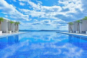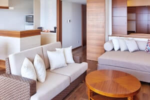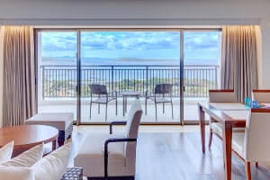 沖縄美ら海水族館まで車で約8分と近く、全室オーシャンビューでキッチン付の55平米以上のスイートタイプです。朝食では毎朝シェフ手作りのモッツアレラチーズや地元食材を使った料理をお楽しみいただけます。隣接する「オキナワハナサキマルシェ」には約15店舗のグルメやお土産ショップが集まり、お客様のリゾートステイを彩ります。