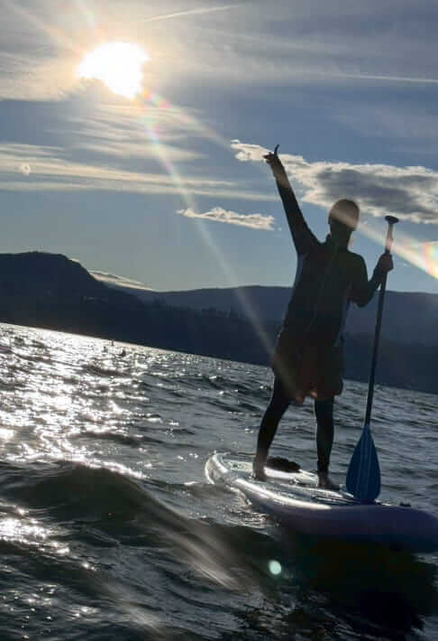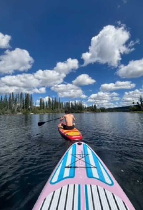 観光客で賑わうダウンタウン近くのビーチでは、パラセーリングやバナナボートも楽しめる …が、我々は、街北部の地元民が集まる遠浅ビーチ(Gyro Beach)や近隣の湖でSUPボードにチャレンジ。(お手軽価格でSUPやカヤックのレンタルあり)